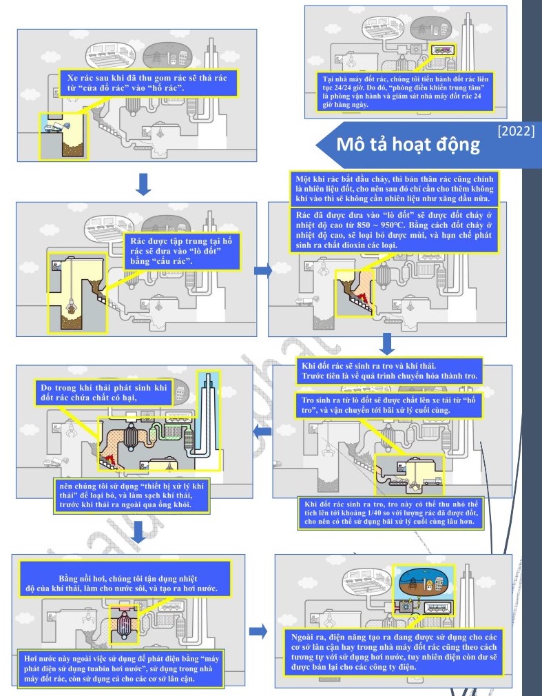 Đầu tiên, rác được đưa về khu tập kết sau đó phân loại. Rác có thể tái chế được tách riêng như thủy tinh- sắt- nylon- nhựa. Các loại rác không thể đốt như: đất, đá, beetong...được xử lý bằng chôn lấp. Rác hữu cơ và mùn được ủ làm phân bón. Phần còn lại tạp chất như: giấy, vải, một phần nylon... được đem đốt trong lò nhiệt độ cao.